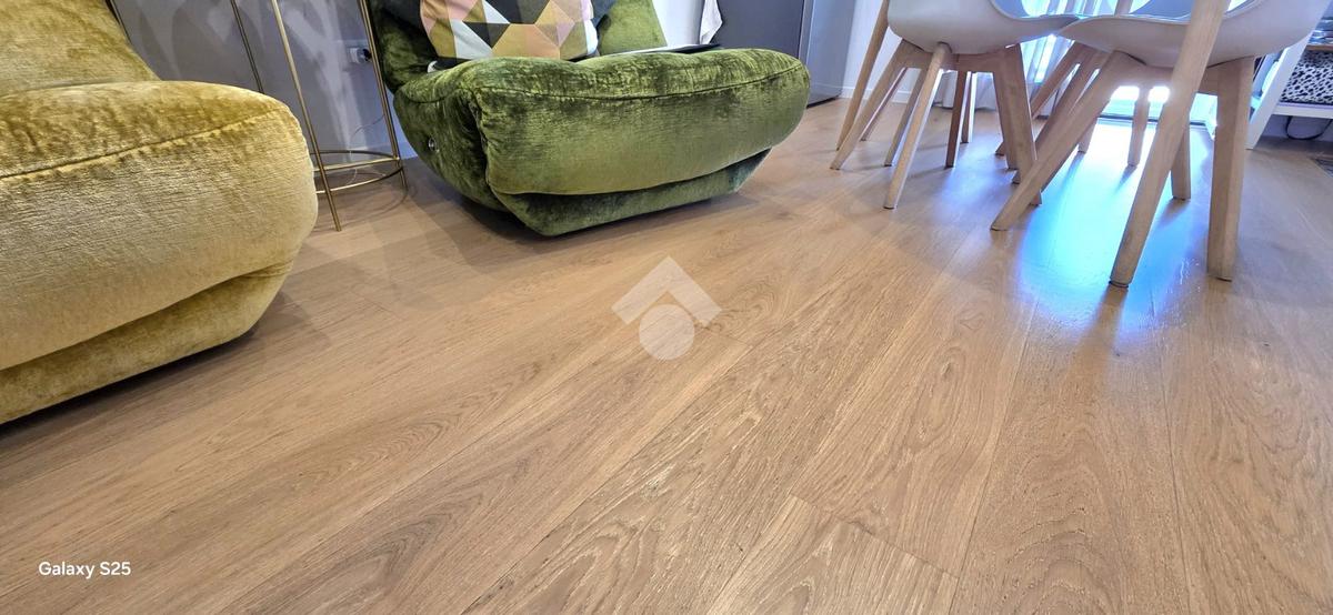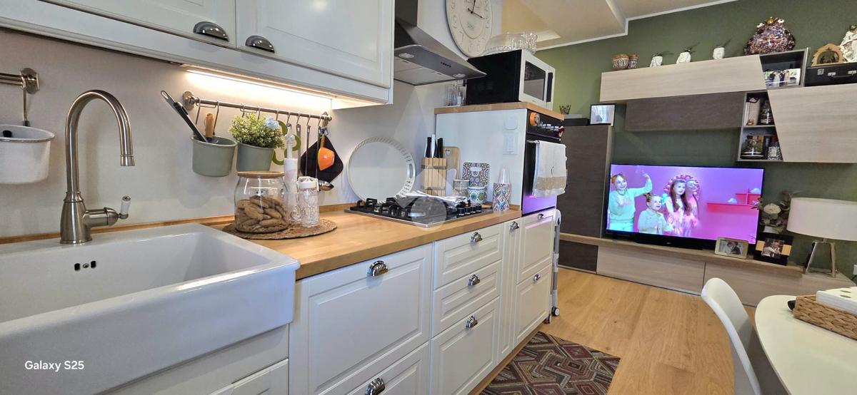 L’ingresso apre su un luminoso soggiorno a vista con angolo cottura, uno spazio conviviale perfetto per accogliere amici e familiari.